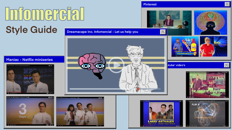 As the art director it was my job to make sure everyone was on the same page about how everything would look. So I searched on pinterest, youtube and other web-places. I am a fan of the show 'Maniac' on Netflix and took big inspiration from one of their 'infomercials'. The story takes place around the year 2000 and is made by a couple of scientists who know nothing about making videos, so the editing and pacing is a bit funny and crooked on purpose.